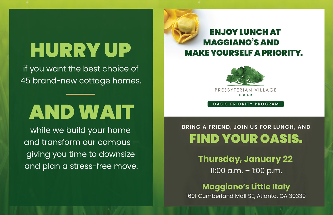 Maggiano’s Little Italy 1601 Cumberland Mall SE,, Atlanta, GA, United StatesWE ARE SOLD OUT. We're sold out for our Lunch at Maggiano's event, but we have more events coming up. To learn more about everything that's coming to Presbyterian Village Cobb, please join us on February 10 for our Zoom event. Lunch will be served. Advance registration is required. Don’t miss your chance to…